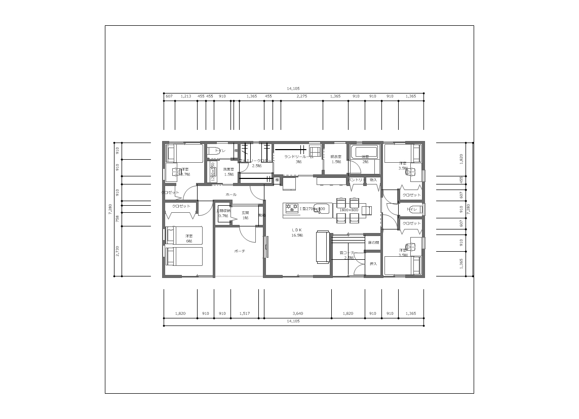 【間取り例】平屋建て 4LDK 28.75坪 (1s1595)